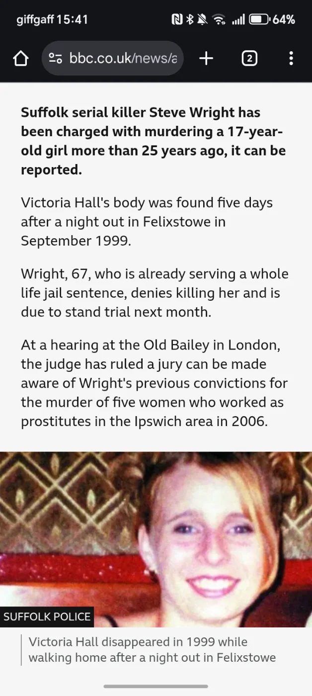 ''Serial killer Steve Wright has been arrested in connection with the unsolved murder of a 17-year-old girl who died in Felixstowe in 1999, according to a report.