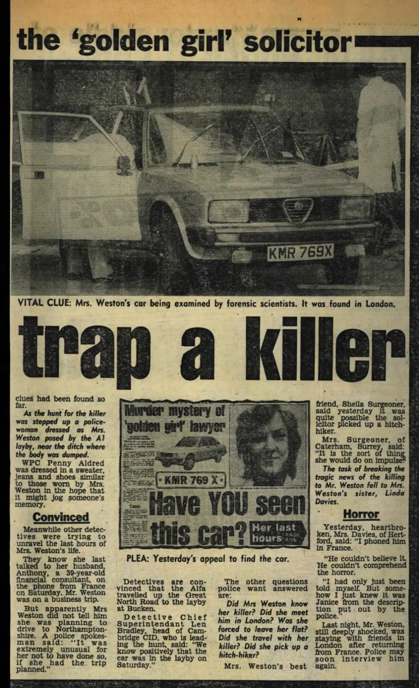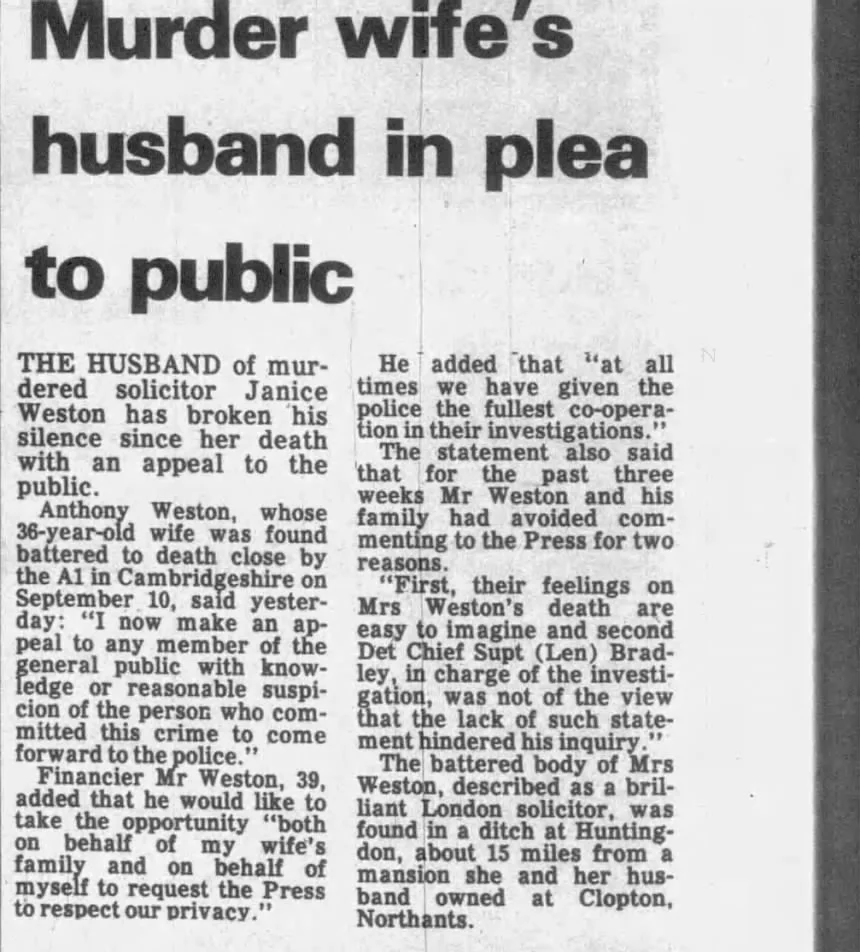 One thing that has struck me is that after the murder there is no request by Tony Weston in the media to find his wife's killer. You only read about him making a complaint about how he was interviewed. If he loved his wife. Why didn't he use some of the money to keep awareness about the case open until his final days, to find the perpetrator? Thats a big red flag for me.