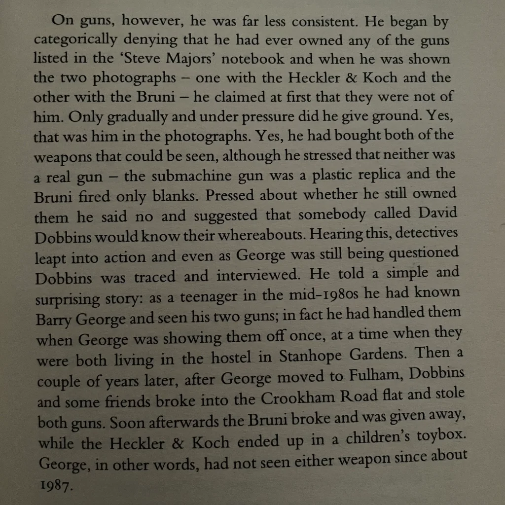 His behaviour around this time was definitely unsettling, but I’ve always found it curious that the prosecution couldn’t call upon anyone to attest that George had possessed a gun - imitation or otherwise - after this period, and certainly not at any point in the run up to Jill Dando’s murder. This passage in Cathcart’s book makes it clear as to why:
