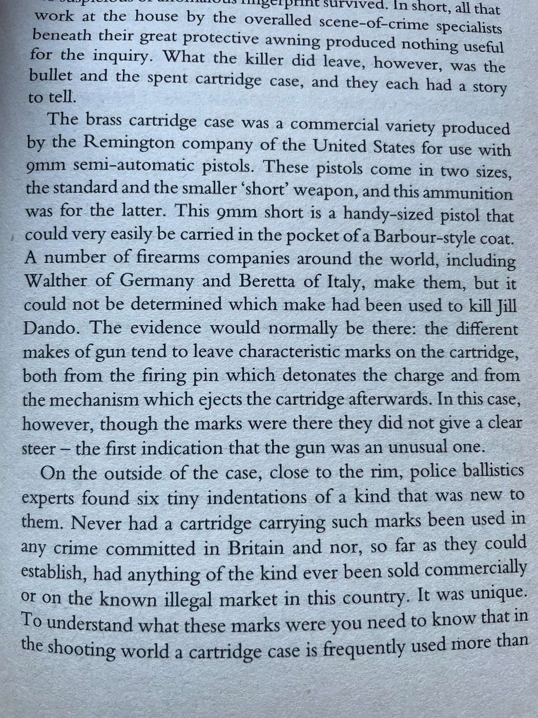 The brass cartridge case was a commercial variety produced by the Remington company of the United States for use with 9mm semi-automatic pistols. These pistols come in two sizes, the standard and the smaller 'short' weapon, and this ammunition was for the latter. This 9mm short is a handy-sized pistol that could very easily be carried in the pocket of a Barbour-style coat. A number of firearms companies around the world, including Walther of Germany and Beretta of Italy, make them, but it could not be determined which make had been used to kill Jill Dando. The evidence would normally be there: the different makes of gun tend to leave characteristic marks on the cartridge, both from the firing pin which detonates the charge and from the mechanism which ejects the cartridge afterwards. In this case, however, though the marks were there they did not give a clear steer - the first indication that the gun was an unusual one.