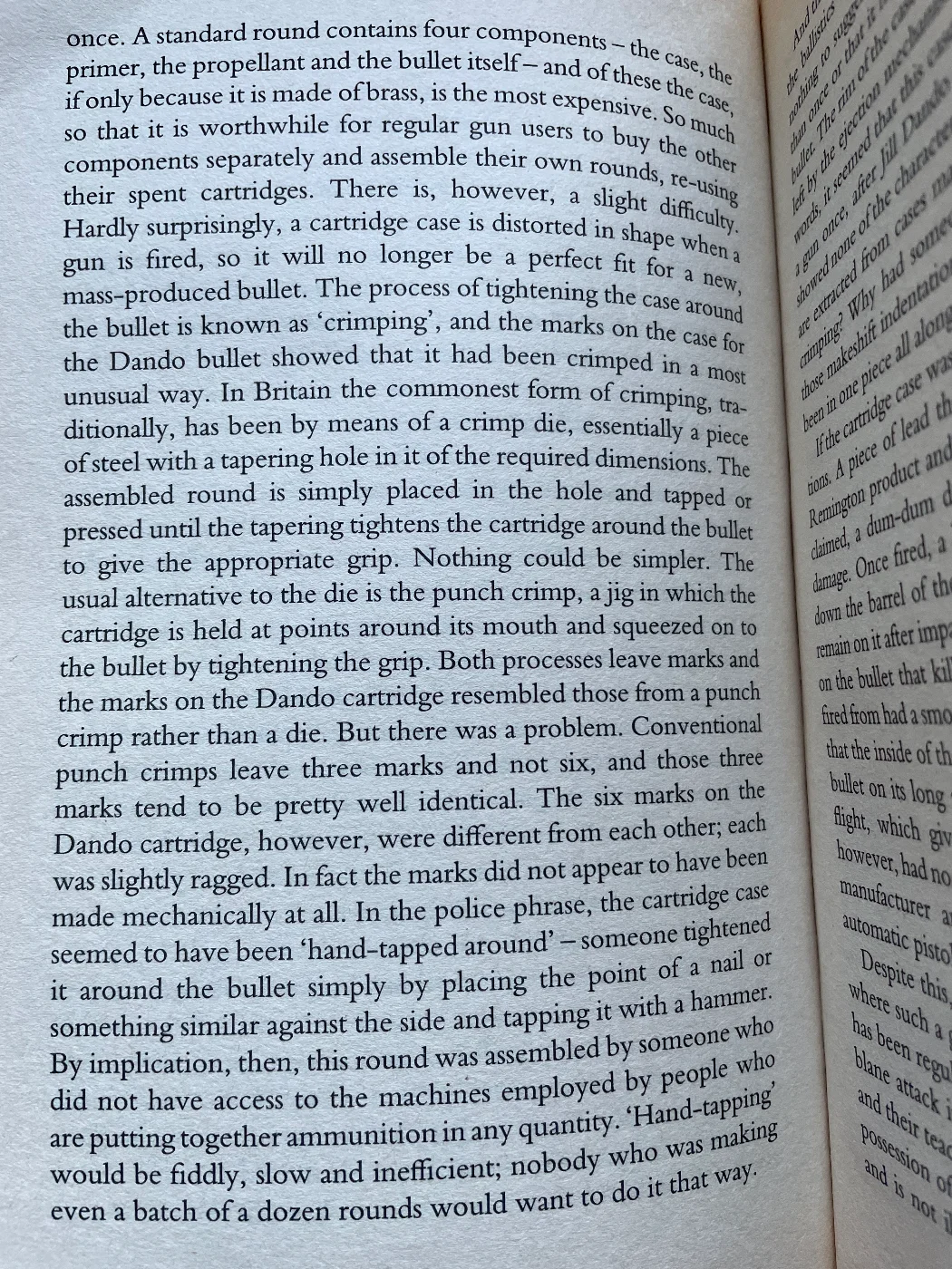 On the outside of the case, close to the rim, police ballistics experts found six tiny indentations of a kind that was new to them. Never had a cartridge carrying such marks been used in any crime committed in Britain and nor, so far as they could establish, had anything of the kind ever been sold commercially or on the known illegal market in this country. It was unique. To understand what these marks were you need to know that in the shooting world a cartridge case is frequently used more than once. A standard round contains four components - the case, the primer, the propellant and the bullet itself - and of these the case, if only because it is made of brass, is the most expensive. So much so that it is worthwhile for regular gun users to buy the other components separately and assemble their own rounds, re-using their spent cartridges. There is, however, a slight difficulty. Hardly surprisingly, a cartridge case is distorted in shape when a gun is fired, so it will no longer be a perfect fit for a new, mass-produced bullet. The process of tightening the case around the bullet is known as 'crimping', and the marks on the case for the Dando bullet showed that it had been crimped in a most unusual way. In Britain the commonest form of crimping, traditionally, has been by means of a crimp die, essentially a piece of steel with a tapering hole in it of the required dimensions. The assembled round is simply placed in the hole and tapped or pressed until the tapering tightens the cartridge around the bullet to give the appropriate grip. Nothing could be simpler. The usual alternative to the die is the punch crimp, a jig in which the cartridge is held at points around its mouth and squeezed on to the bullet by tightening the grip. Both processes leave marks and the marks on the Dando cartridge resembled those from a punch crimp rather than a die. But there was a problem. Conventional punch crimps leave three marks and not six, and those three marks tend to be pretty well identical. The six marks on the Dando cartridge, however, were different from each other; each was slightly ragged. In fact the marks did not appear to have been made mechanically at all. In the police phrase, the cartridge case seemed to have been 'hand-tapped around' - someone tightened it around the bullet simply by placing the point of a nail or something similar against the side and tapping it with a hammer. By implication, then, this round was assembled by someone who did not have access to the machines employed by people who are putting together ammunition in any quantity. 'Hand-tapping' would be fiddly, slow and inefficient; nobody who was making even a batch of a dozen rounds would want to do it that way.