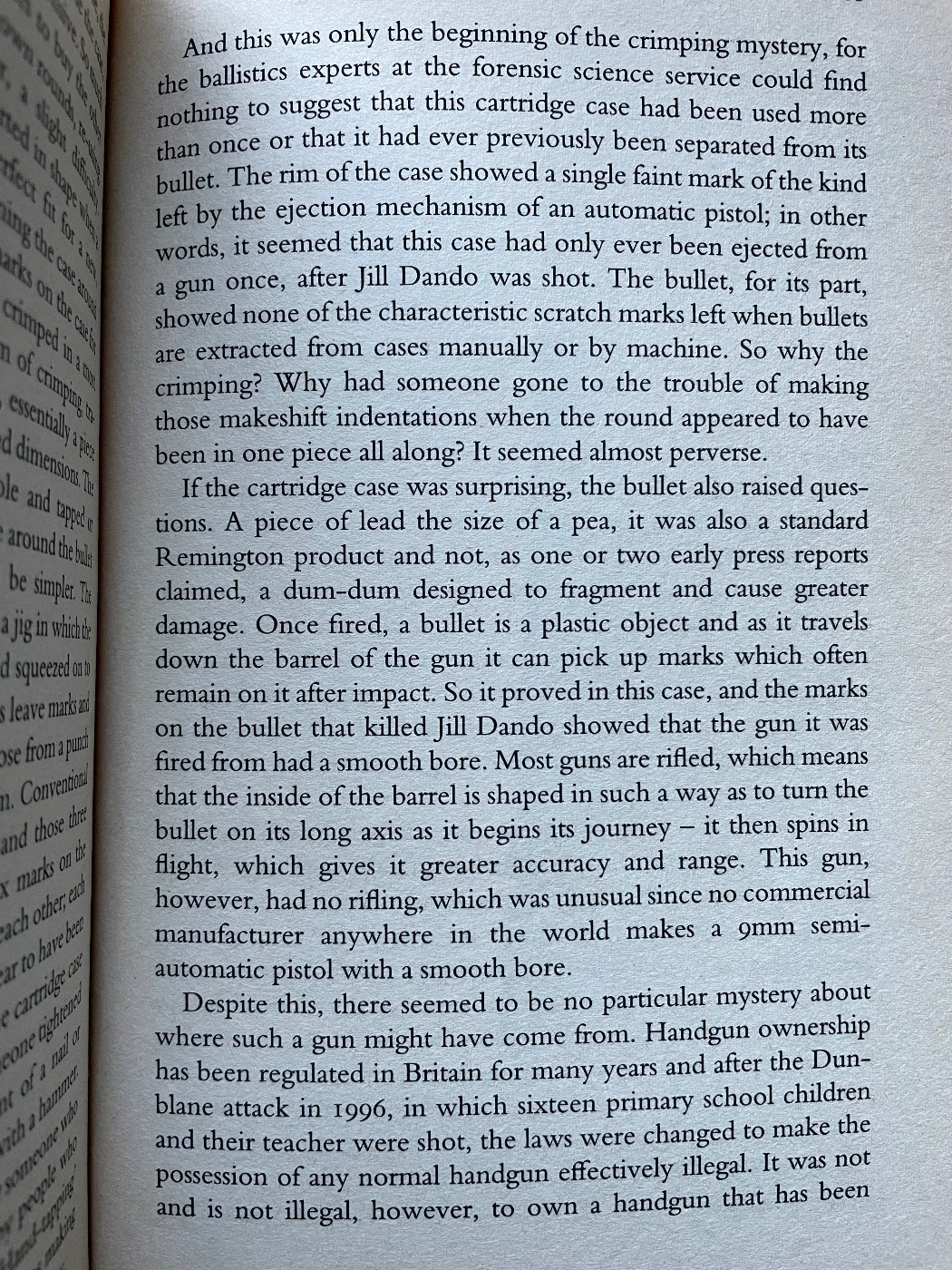 And this was only the beginning of the crimping mystery, for the ballistics experts at the forensic science service could find nothing to suggest that this cartridge case had been used more than once or that it had ever previously been separated from its bullet. The rim of the case showed a single faint mark of the kind left by the ejection mechanism of an automatic pistol; in other words, it seemed that this case had only ever been ejected from a gun once, after Jill Dando was shot. The bullet, for its part, showed none of the characteristic scratch marks left when bullets are extracted from cases manually or by machine. So why the crimping? Why had someone gone to the trouble of making those makeshift indentations when the round appeared to have been in one piece all along? It seemed almost perverse.