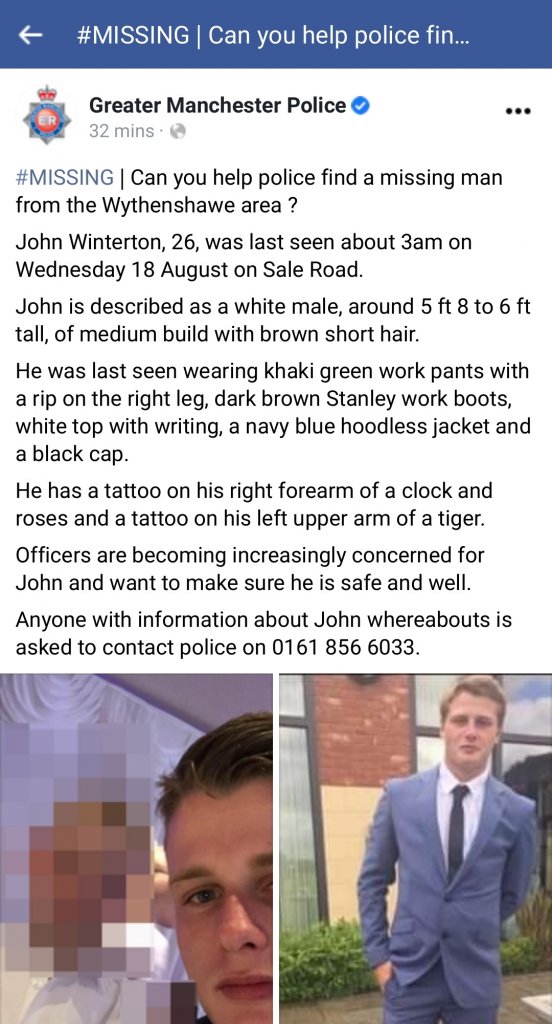 John Winterton went missing in the Wythenshawe, Manchester area sometime between 04 - 06am on Wednesday, August 18, from his sister's house. His dad checked on him at 06.45am and found him gone.