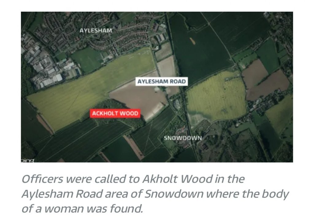 The body of Julia James, 53, was found on the edge of Akholt Wood in Snowdown, near Aylesham, shortly after 4pm on Tuesday.