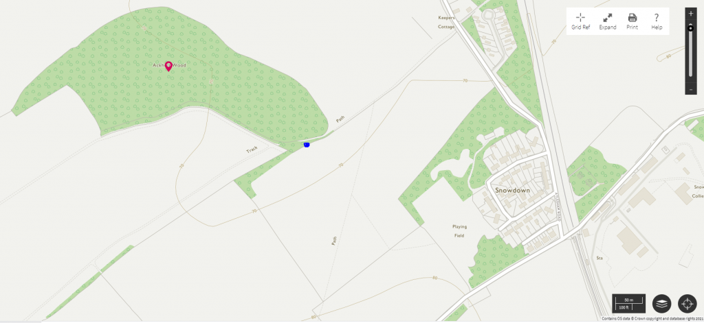 OS maps show the paths, I've put a blue dot roughly where I think the forensic tent is.