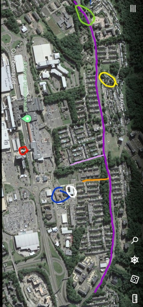 RED Circle - CCTV from Lift at cumbernauld town centre confirmed at 2.44am, this leads to a bridge over the dual carriage way and a rooftop carpark if going up. If going down it leads to Fleming House offices and another ground level car park outside the Antonine shopping centre - if the times she is seen after this are correct I believe she took the lift up and went across the bridge and to the roof and I will explain why. If she took the lift up it and walked in that direction it would be consistent with the times she was seen and how long it would take to reach these areas from that lift.