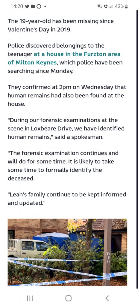 Just seen that an update as of 14.00 was that human remains had been found at the property Human remains found in search for missing teenager Leah Croucher | ITV News
