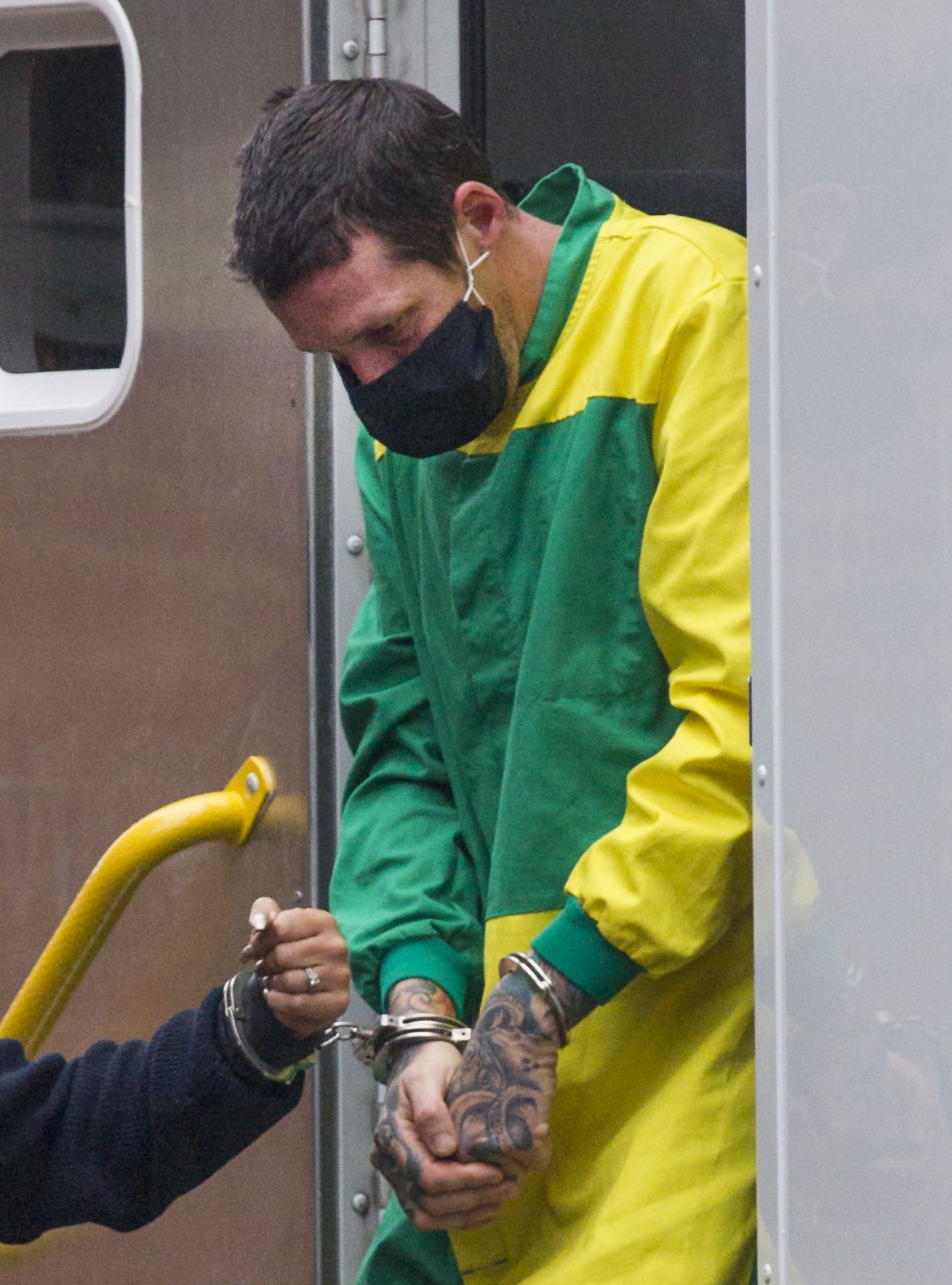 Dressed in a yellow and green jumpsuit and a black face mask, a handcuffed Brown is led towards the court by a prison officer.