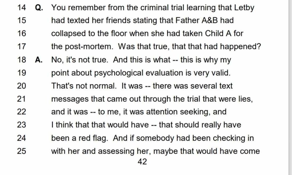 I'm not sure - I think the mother would be expected to be there but if the dad was present less prior then maybe he wasn't?Yeh the short actual quote is "dad was on the floor crying". I'm not sure that makes sense. If she lied why wouldn't she take into account that other staff had seen the same and the accounts would differ? You would also add the "on the floor" only contextually to someone who wasn't there or if the dad wasn't expected to be there, situationally was he expected to be or not? I think he was