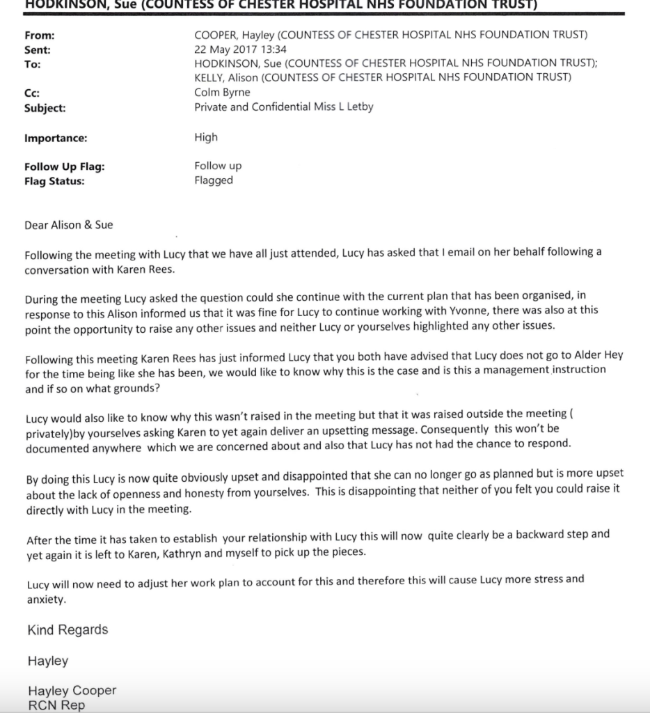 Alison Kelly & HR's Sue Hodkinson get an email from LL's RCN rep Hayley, on behalf of LL