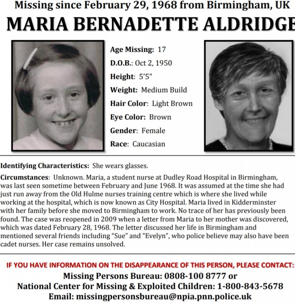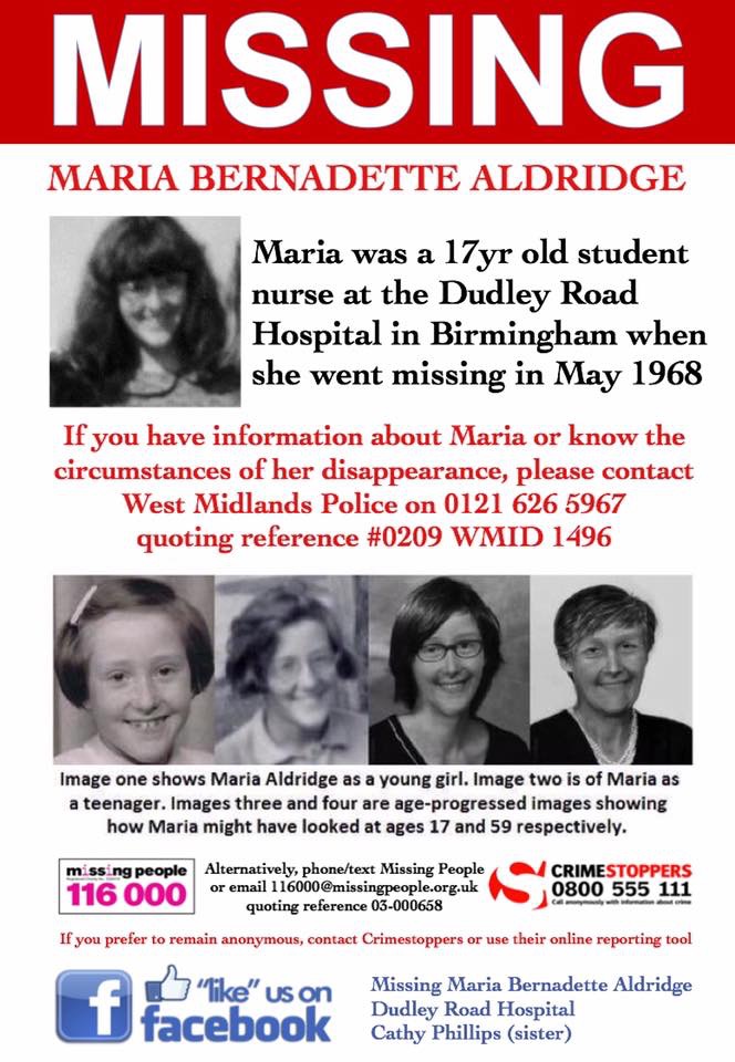 - Student nurse Maria Aldridge, of Stourport, Worcs, vanished, aged 17, in 1968