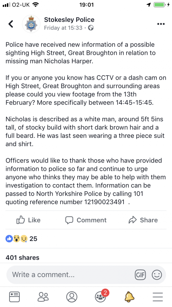 He was last seen at 7am on Thursday 7 February leaving his home address in Pickering in his black 15-reg Citroen Picasso to go to work in York.