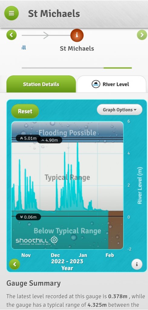 There was some water about quite recently in that area but I don't know if it was actual flooding. High levels certainly. This gauge is below the weir but the heights are in metres and that Weir is only small so at some point it will become irrelevant. It seems to be there to keep water in that section of the River in summer. Perhaps it was installed by the owners of the stately home so they could go boating.
