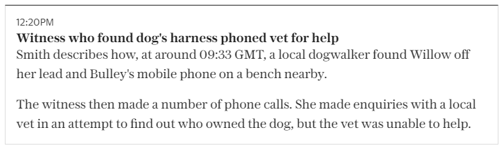 2. We are now told that the person who found the phone also phoned the Vet for help (see screenshot). I didnt know this - did others know this? My understanding was that the lady who found the dog initially walked off, phoned her daughter who then phoned PA. This is the first mention of this phone call to the Vet AFAIK. What is strange is that my understanding was that the lady recognised the dog, and therefore knew how to get in contact with the owners - but the phone call to the Vets suggests she didn't know who owned the dog. Am I getting confused here, or do the waters get more and more muddy with every police presser (no pun intended).