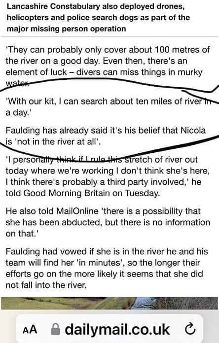 In the middle of a business conference per cell phone? Who does that? And who releases his dog from the leash beforehand? - I find this suspicious. MOO of course.From the first press release, all available in the media thread, Lancs Police said no apparent suspicious circumstances, all avenues of investigation remain open, we believe at this time she has entered the water. This remained the case with every LE update. So they never ‘stated’ as in open and shut but they did say based on available information and evidence NB has entered the water.