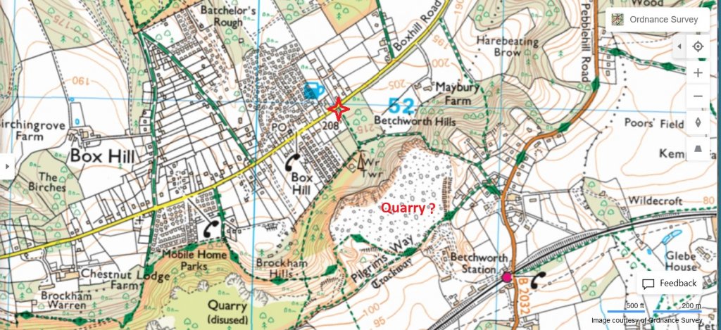 I assumed references to dropping off were used fairly loosely and, most probably, the taxi driver just dropped her at the pub car park where it would be easy to pull in and turn round. Not a lay by in the strict sense but the obvious place. The old quarry is at the base of Box Hill if you follow a straight line from The Tree down the hill toward Brockham (which is next to her home village of Betchworth). It is just on the Box Hill side of the railway line and is now a fishing lake. I think there are additional minor quarry workings in the vicinity of the lake but tree covered and much less significant. At the time the quarry area was searched by both police and sniffer dogs, to no effect. I do not know if the lake was dived but given the commercial fishing use a body would have almost certainly been snagged or detected during maintenance.