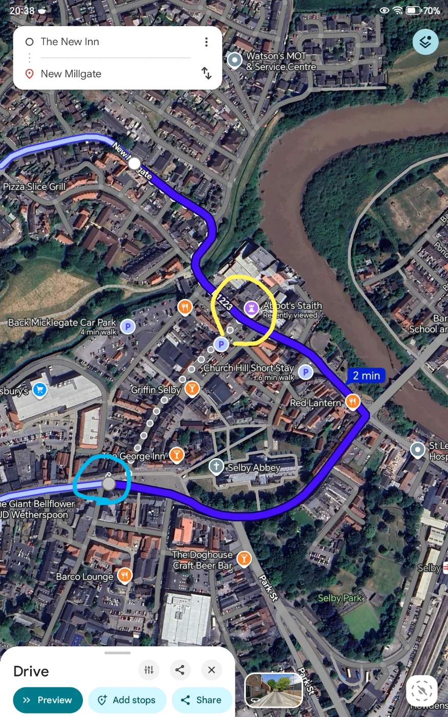 Blue circle is the New Inn pub, yellow circle is the old flour factory.