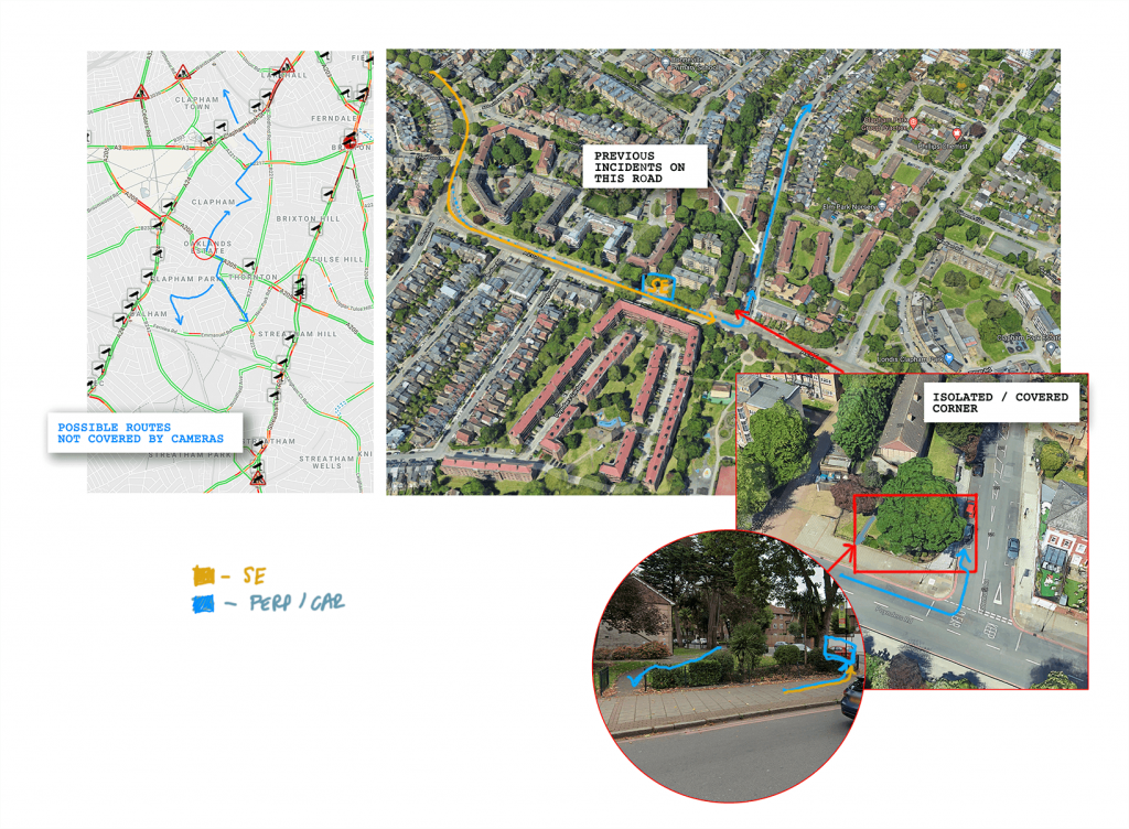 - Could use highlighted area for coverage to coerce her and then make off up rodenhurst and wind around any of the routes to evade detection