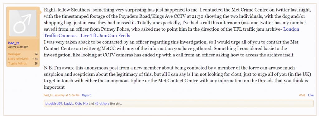 It also weirds me out that the Met tweeted that they would pass this information onto local officers. That’s odd to me because all the other information people tweeted at the MetCC was met with replies of ‘send us a DM to discuss this privately’ and no further response publicly because I assume it was all happening legitimately in DMs. The fact that this one was replied to with ‘the information will be passed on to local officers’ is weird to me but maybe it’s just because I’m now questioning every single thing the Met have been doing in relation to this case.