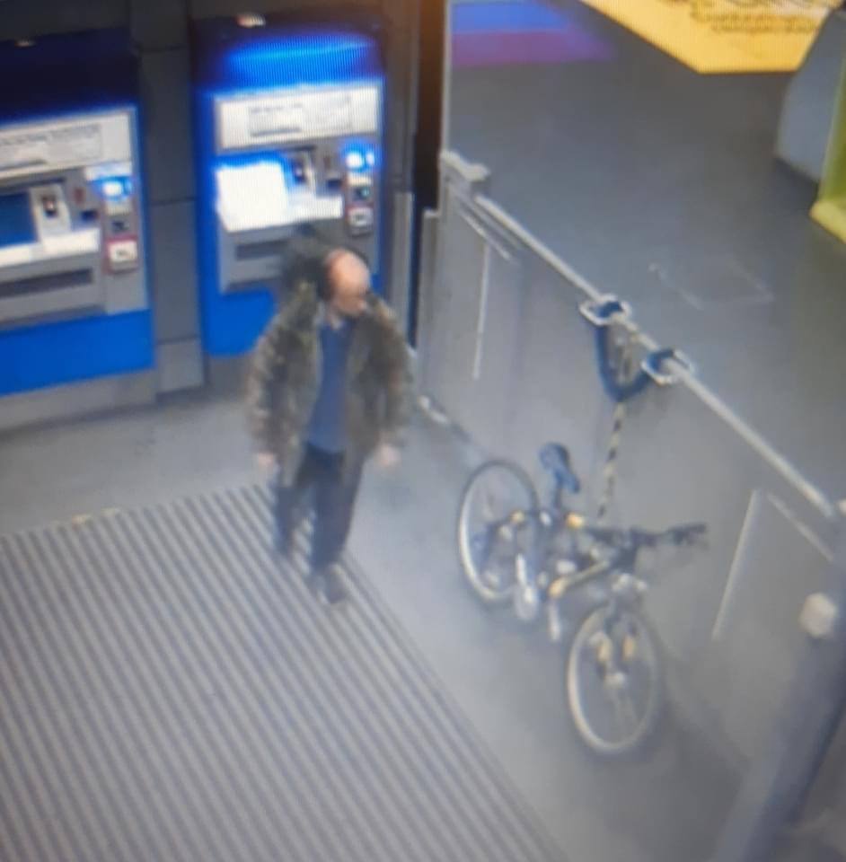 The 31-year-old was wearing black Puma trainers, grey tracksuit trousers, a light blue polo top and possibly a camouflage jacket while riding a black bike.