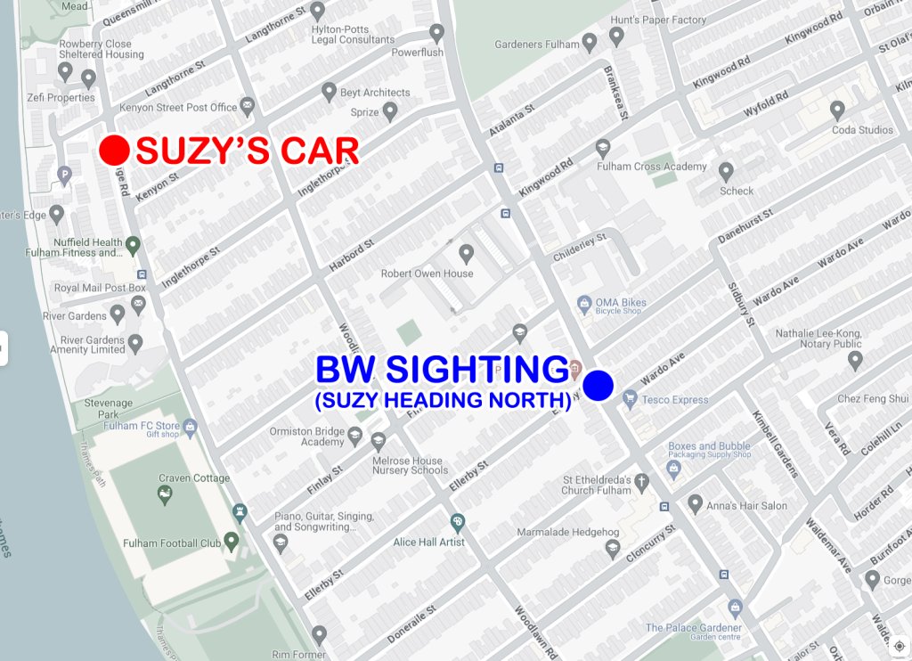 - Why did she immediately get into another car there and go to 37SR (the police must think this happened if they believe both WJ and HR)? Who organises a viewing of one property by meeting at another that's in the opposite direction?