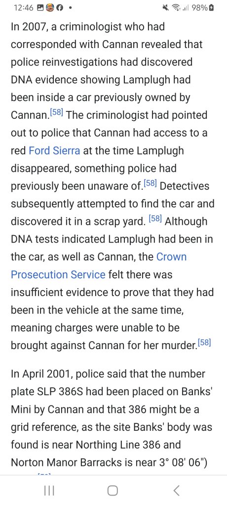 Cannan did have an alibi and knows where he was. He went back to Sutton Coldfield and gave his mother, sister and brother-in-law as persons able to verify this. The police did not check in 1990 and all three were dead by 2000. They decided this meant he had no alibi. In fact, he had provided one at the time. He had nowhere else to go and had no money.