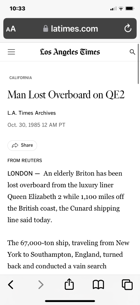 Just had a look at the QE2 story - quick search says yes passenger deaths and missing passengers in the 1980s - needs more investigation if you think it could be relevant