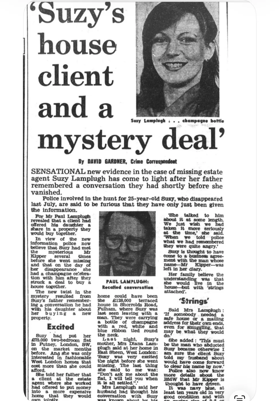 Perhaps the person SL DID see on Sun eve was a ‘commercial’ contact though, not so much a love interest. We do know via her uncle this deal to buy the house she couldn’t otherwise afford was troubling her & her business associate was pressurising her. Her unusually good mood on Mon am, pre NH taking commission, she’d assumed was hers, might be because she’d finally adjusted the terms of deal OR pulled out. The police did feel in 86 this house deal was key, vital & they didn’t know about it early on. The last conversation she apparently had with her parents was on this very deal - will post press article.