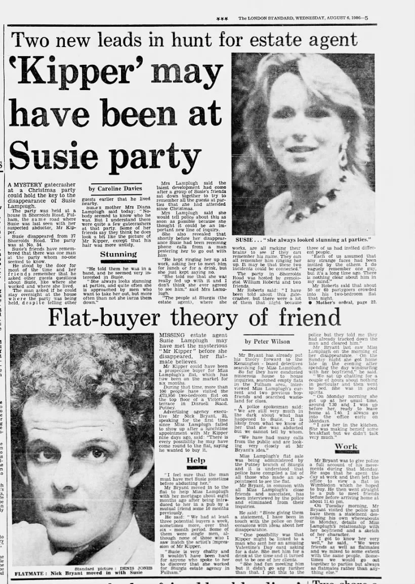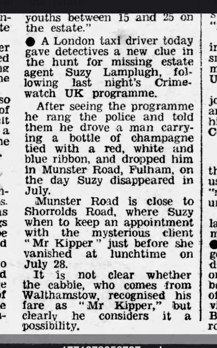 Excellent posts @Klclevi - in particular it’s interesting to see it mentioned that Suzy’s purse was in the glove compartment of her car, this is also where the Suzy Lamplugh Trust say it was found. And on HR, he says he glimpsed the couple outside 37SR for no more than 2-3 seconds, I knew it wasn’t a great look at them that he got but didn’t realise it was that short a time period. And through net curtains! He’s described as seeing ‘Susie’ but as we know now he never actually positively identified seeing her.