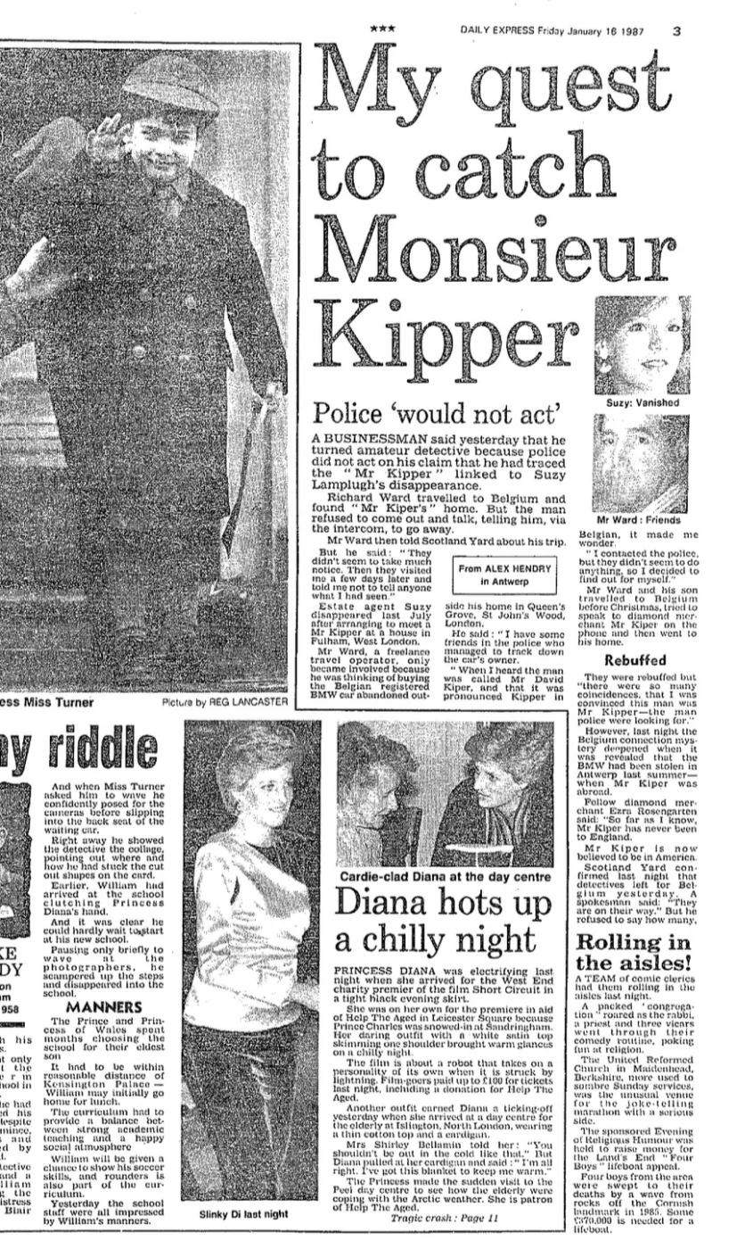 Indeed. But also I find it curious that right from the off it’s being suggested by those who knew Suzy that this story was more than mere ‘man posing as house-buyer abducts estate agent’. Take NB, who says: “I feel sure that the man must have met Susie sometime before abducting her.” While in a separate story her friends were said to be compiling lists of guests at recent parties, in case ‘Kipper’ had been in attendance. Perhaps imaginations were simply going into overdrive in those early, frenetic days, but it suggests to me the flatmate and friends had reason to suspect this was more than a simple house viewing gone wrong. There was evidently a lot going on in this woman’s life and I’d be surprised if her nearest and dearest even knew the half of it.