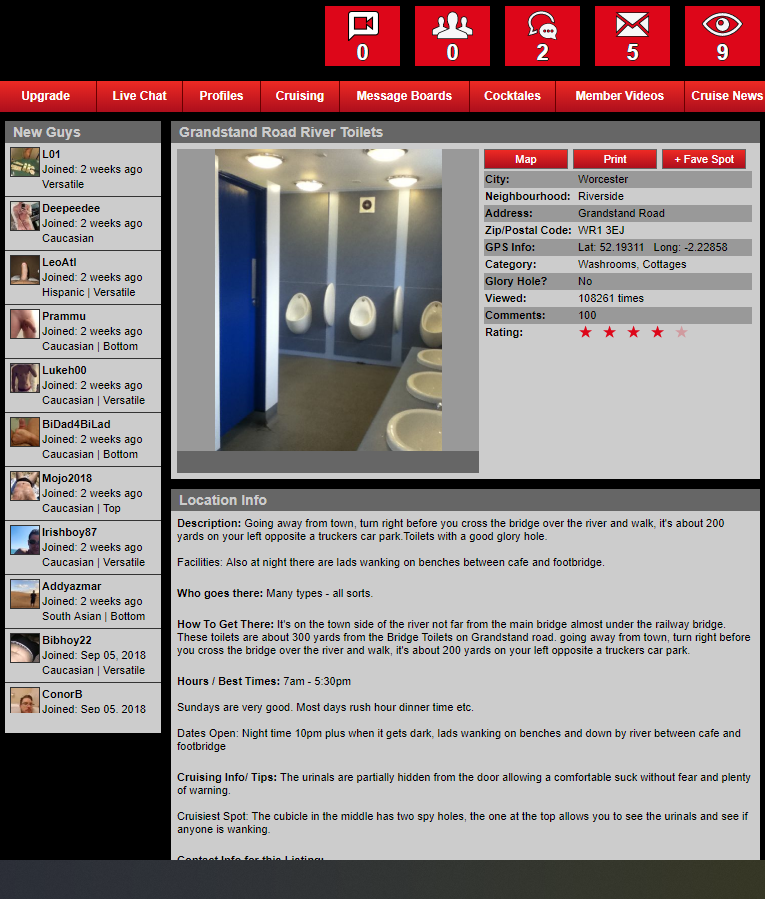 A few years ago a friend of mine showed me a gay hookup website where you can search for cruising spots. I just made a profile and did a search of the area. There is a spot which seems fairly popular around the toilets (52°11'35.2"N 2°13'42.9"W) just before the Sabrina footbridge, in the description it states...