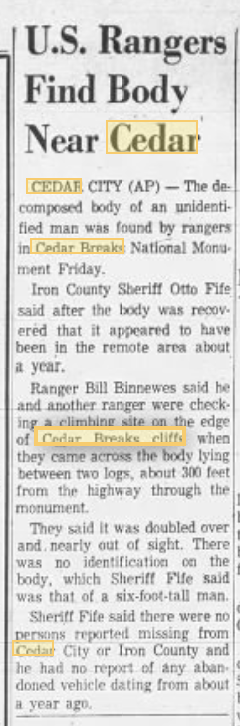 Circumstances of Recovery - Human remains were found by two park rangers near a climbing area of Cedar Break cliffs near Sunset View Lookout at the Cedar Breaks National Monument. The body was situated between two logs, doubled-over, about 300 feet from the highway. There was $1.51 and a flashlight found on the body, along with an empty wallet, an empty metal suitcase, and a cane. The decedent wore a size 8.5 shoe. There was no identification found with the body.