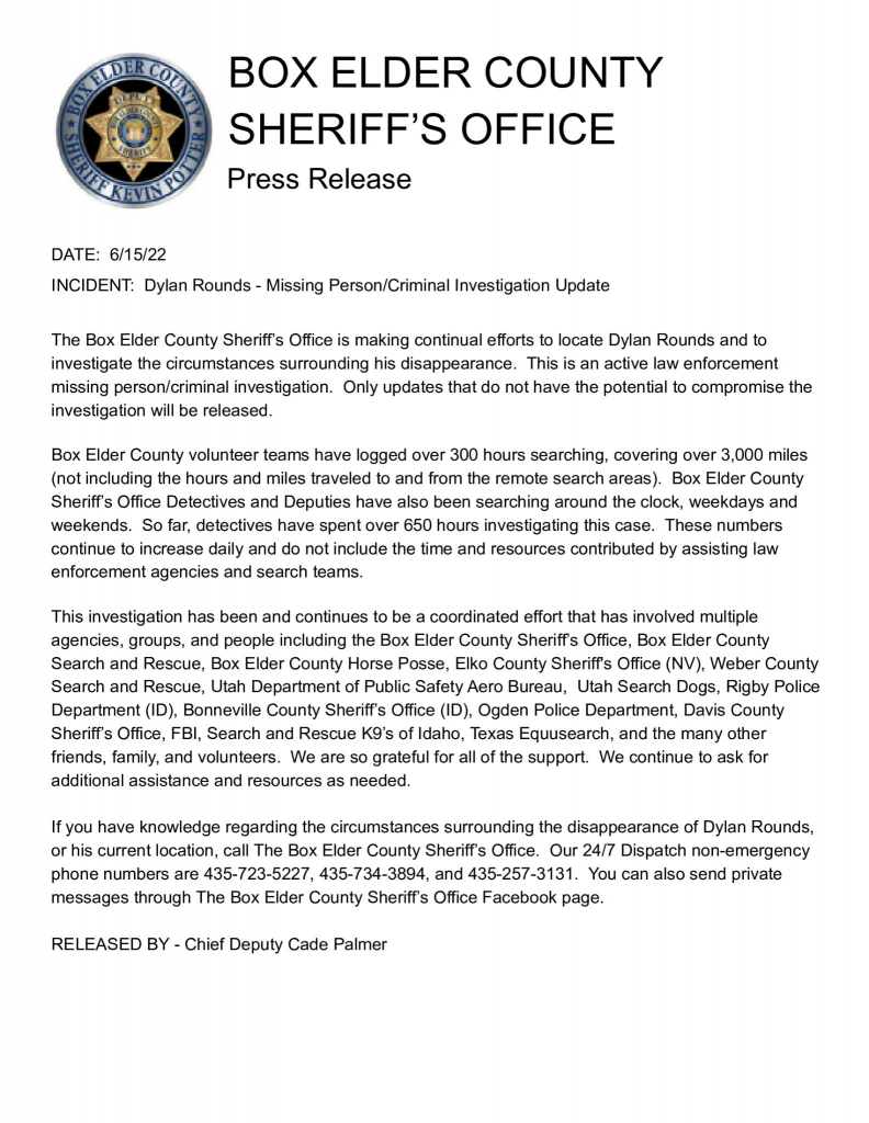 The statement asks that anyone with information contact the Box Elder County Sheriff’s Office at 435-723-5227, 435-734-3894, 435-257-3131, or by private message on the sheriff’s Facebook page, listed as Box Elder County Sheriff’s Department.