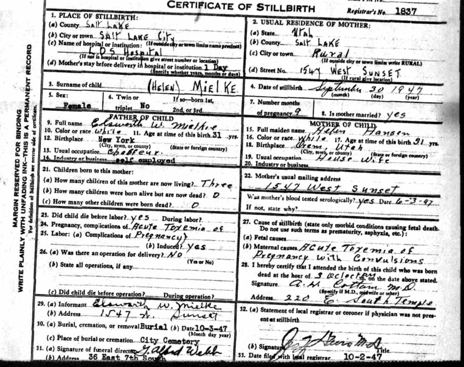 3) Helen and Ellsworth's baby is stillborn September 30, 1947. Certificate of stillbirth lists Elsworth (One L) W. Mielke as the INFORMANT. It also lists him as a chauffeur and self-employed.