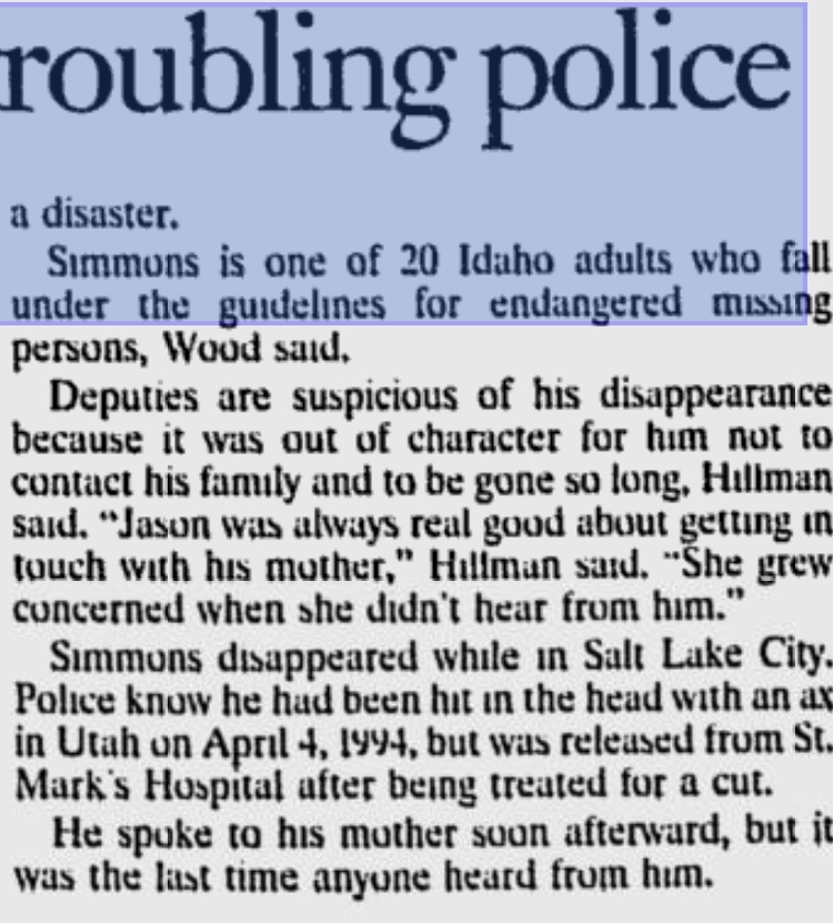 Jack Simmons was reported missing from Utah on on April 14, 1994. His family believes has met with foul play. He may have been involved with illicit drugs.