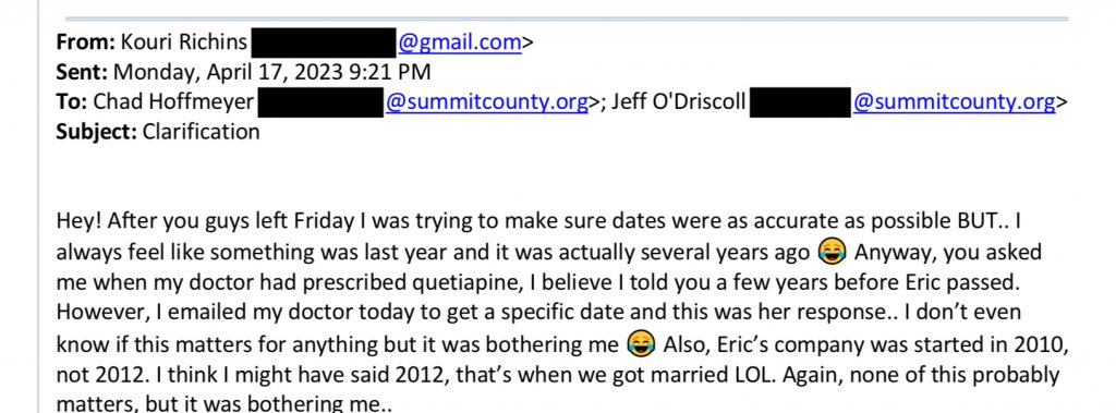 Prior to Kouri Richins’ arrest, the Utah children’s book author accused of killing her husband, she allegedly sent an email to officials. This is what it said.