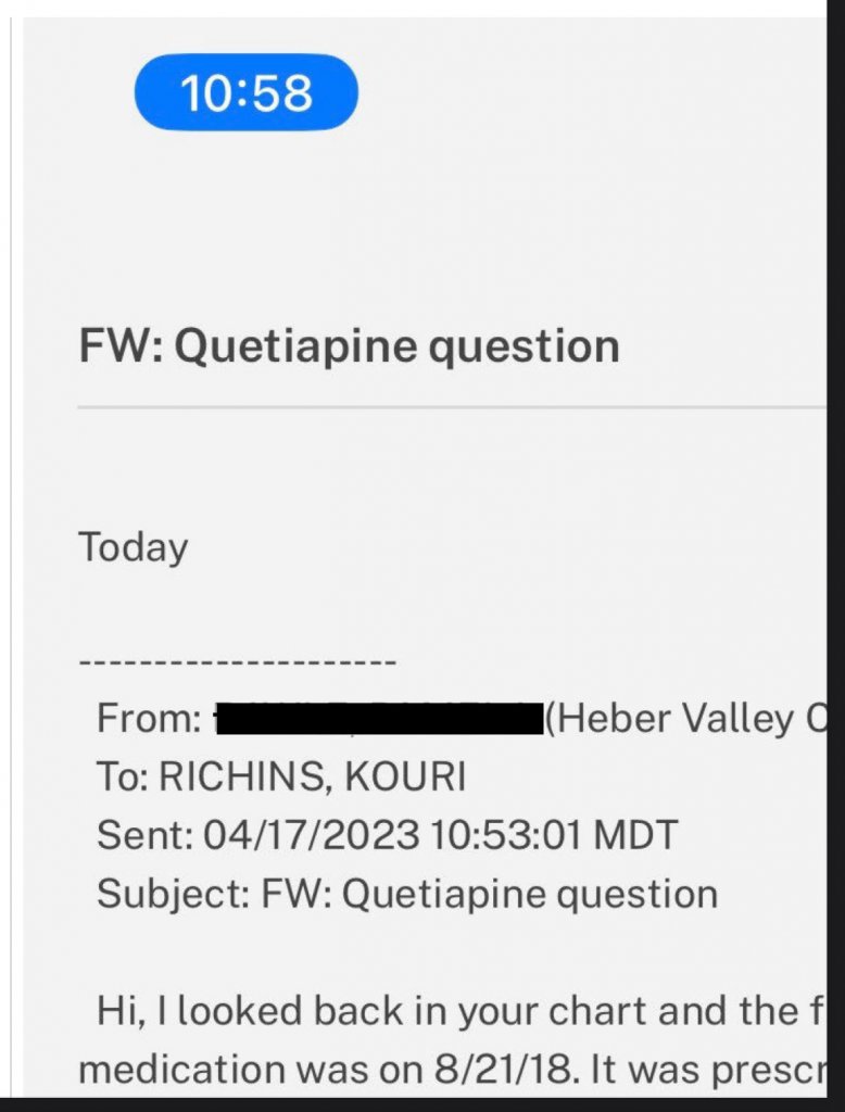 KR last told investigators in an email that her doctor responded to her inquiry and confirmed it was prescribed in 2018 for post partum depression. I did not understand that she's currently taking the Rx or any other per her email.The 2018 rx: Quetiapine