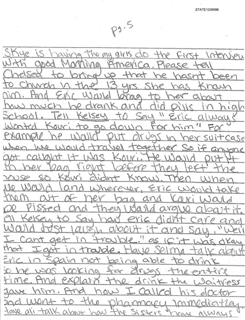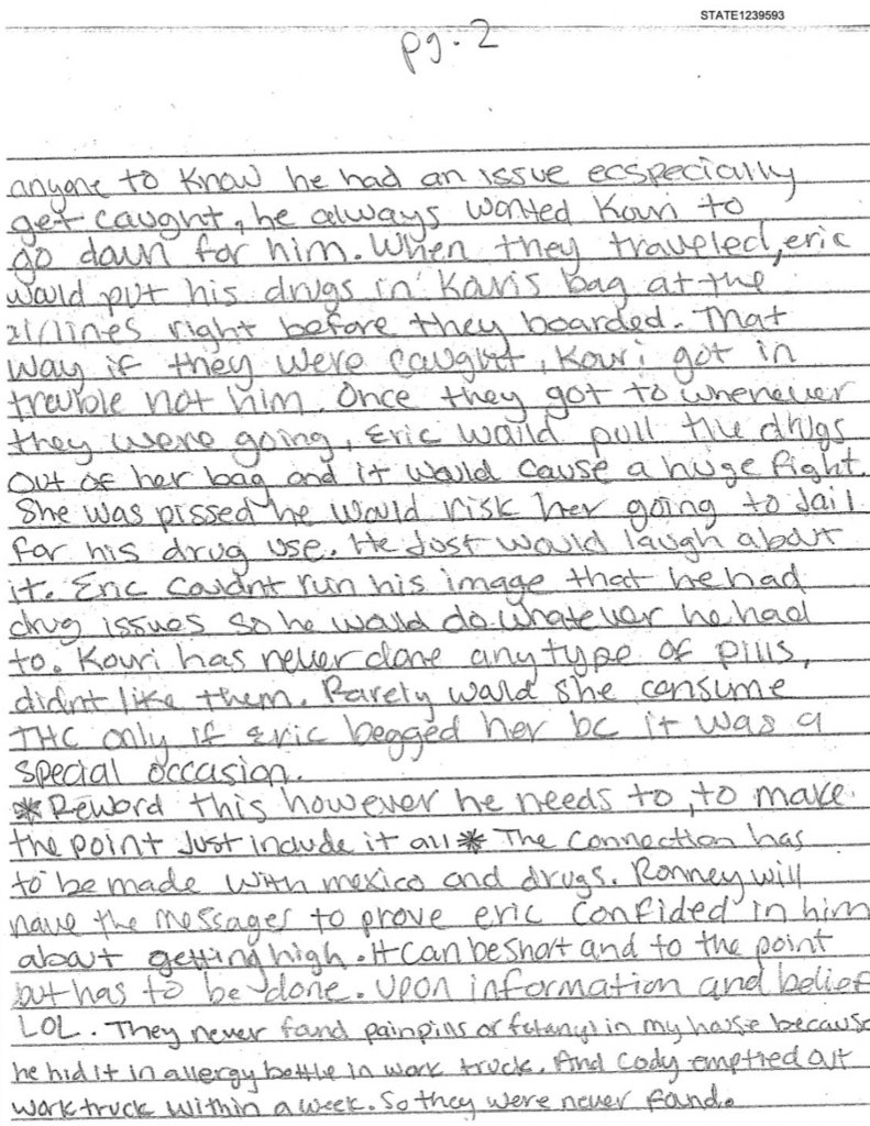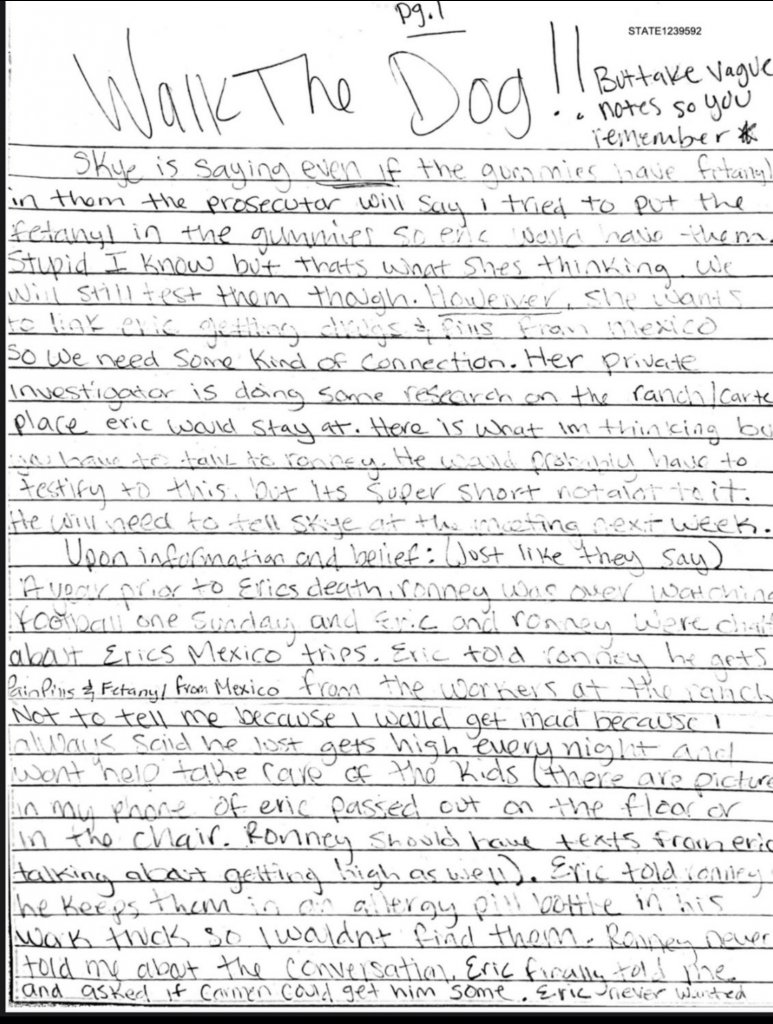 In the letter, she imagines the story Ronney should tell the court. "A year prior to Eric's death, Ronney was over watching football one Sunday and Eric and Ronney were chatting about Eric's Mexico trips. Eric told Ronney he gets pain pills and fentanyl from Mexico from the workers at the ranch," the letter states. "[Eric said] Not to tell me because I would get mad because I always said he just gets high every night and won't help take care of the kids."