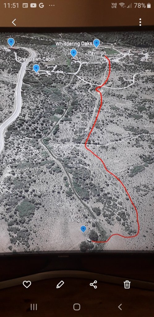 Looks like a bunch of game trails and powerline access tracks in the area. the line you show goes over a a fence that surrounds the "ranch".Trail that leads from whispering oaks pavillion off road straight to the womens camp.