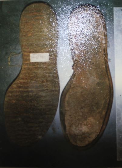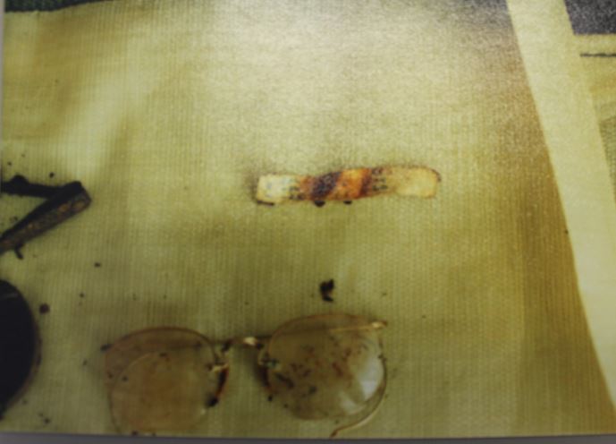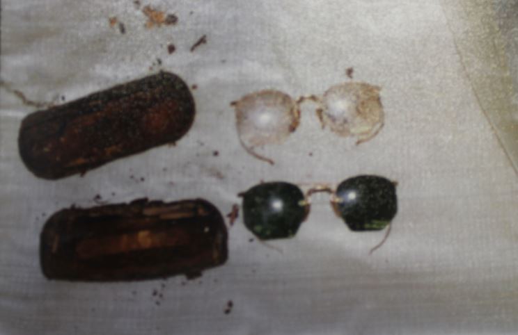 Clothing: (3) plastic buttons, zipper closure with “USA” and “Talon” stamped on I, hard shell glasses case w/velvet lining, (1) pair of glasses w/gold partial wire rim frames and clear lenses, (1) pair of glasses w/gold partial wire rim frames and dark lenses, Glasses Prescription R-50-0.25-12, L-25-25-60. Glasses were made by Bosch and Lomb after 1945. Shoe soles 28cm / 11.02” long.