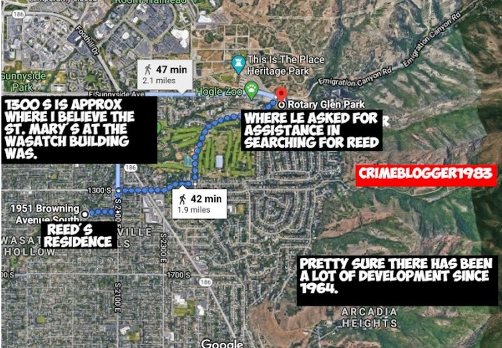 The entrance to St Mary's was at 2640 E 1300 S which is 1.2 miles (almost dead) east of Reed's house with a mild uphill slope. It was right next to the Bonneville Golf Course which dates back to the 1920's. Walking time from the entrance of St Mary's to Reed's house would have been about 28 minutes for a normal person, but Reed was a high school football player so likely much less for him and his dogs. I put red dots on this map to give you an idea where Reed's house was in relation to the entrance to St Mary's. Map copy of USGS.gov