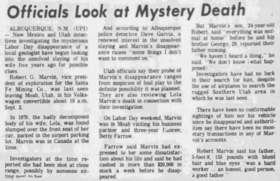 Marvin's wife, Lola Marvin was murdered in July 1979. She was found shot to death in her car, at the Albuquerque Airport. The homicide occurred when Robert Marvin was in Canada on company business.