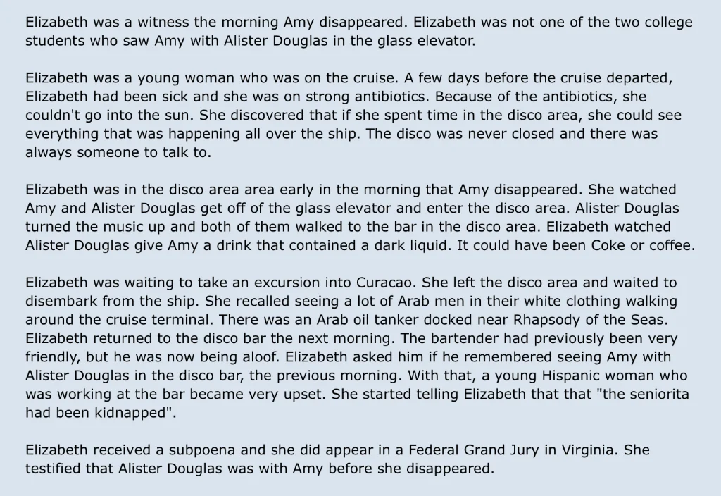 There were three witnesses who saw Amy Bradley with Yellow - Lori Thompson (witness in the Netflix documentary), her friend Crystal Roberts, and Elizabeth. Elizabeth claims she was in the disco the morning Amy and Yellow entered. She testified to a federal grand jury in Virginia.