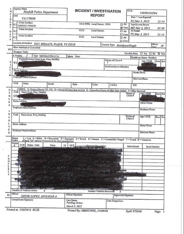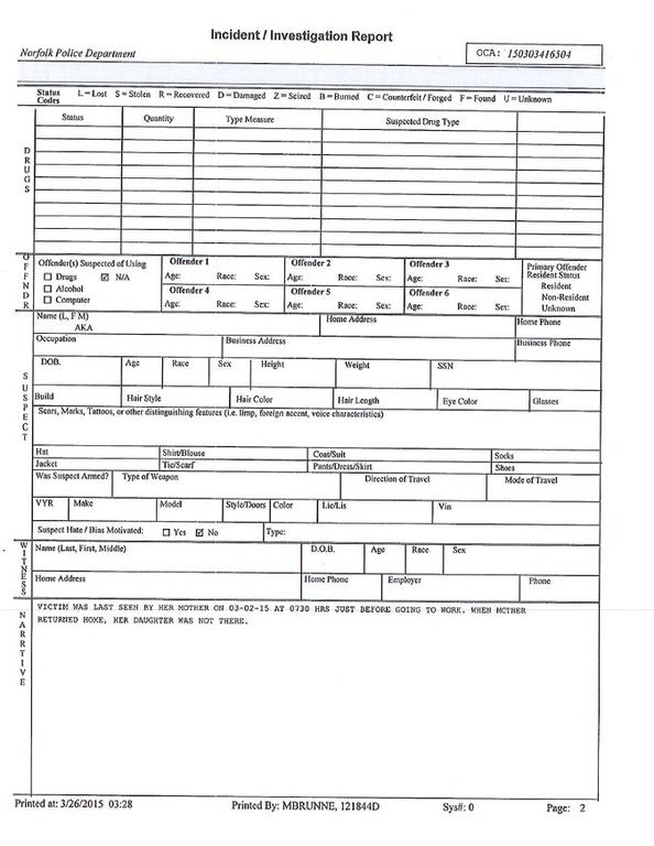 "Victim was last seen by her mother on 03-02-15 at 0730 HRS just before going to work. When mother returned home, her daughter was not there."