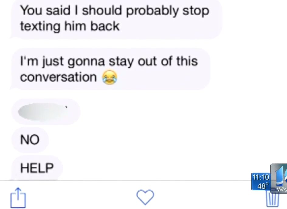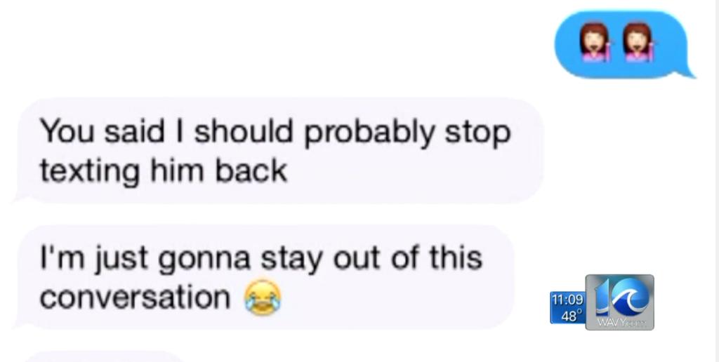 Hm, well. Wait a second. Let's take a look at THE ACTUAL TEXT MESSAGES. They were shown on the WAVY 10 TV news. I screencapped them.