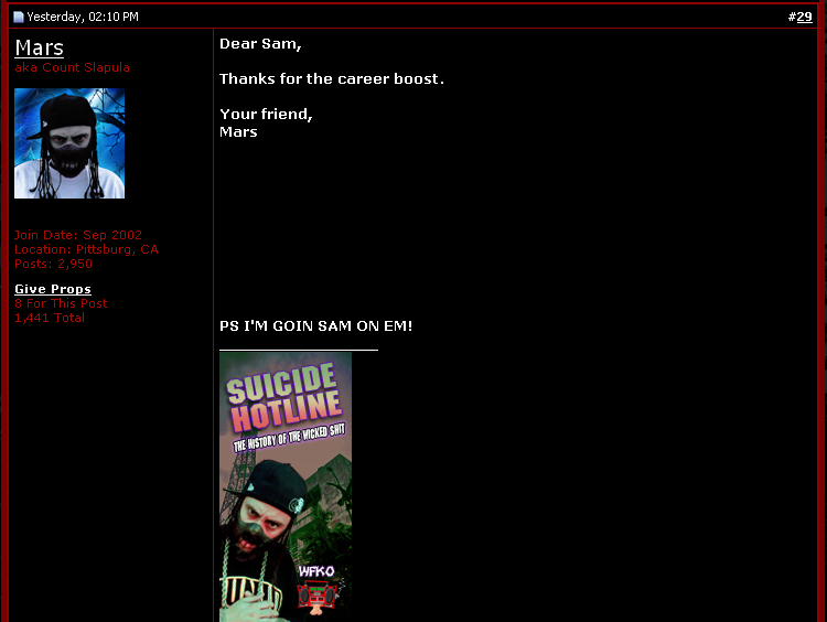 Ugh. I'm getting really tired of Mars lately. I can't believe he is using this tragedy to "boost his career". This is what he said in reply to my post on his message board regarding sending letters to Sam:
