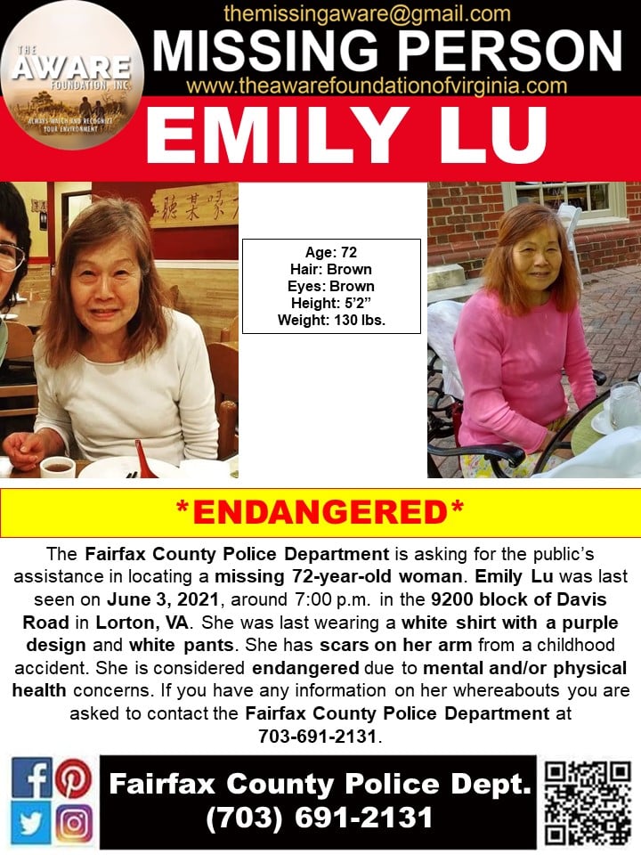 Found Deceased VA - Emily Lu, 72, Lorton, 3 Jun 2021 *Arrest*
