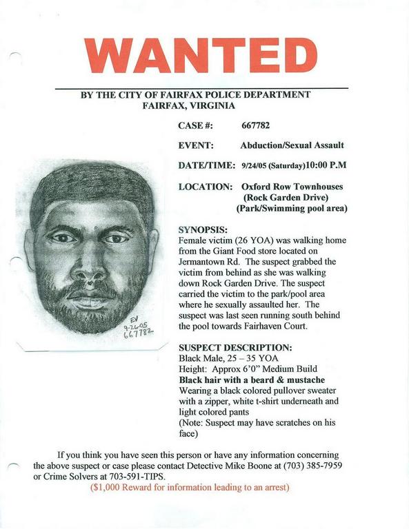 DNA recovered in the Harrington case was linked to an unknown offender in a September 2005 sexual assault in Fairfax City. A 26-year-old woman was attacked at night while walking home from a grocery store. The offender was scared away by a passerby—but the victim got a good look at him, enabling a Fairfax City Police artist to produce a sketch of the attacker.