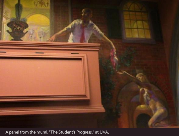 The mural depicts, among other scenes of daily life at the University of Virginiia, a male faculty member standing on a porch and tossing a mostly naked student her bra as his beleaguered wife comes up the stairs. My students and I have pointed out that wildly inappropriate section of the mural to faculty, administrators, students, parents, and donors, but so far, no one has been particularly horrified. The mural is proudly displayed and is prominently featured on UVA tours.>