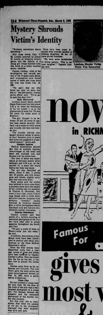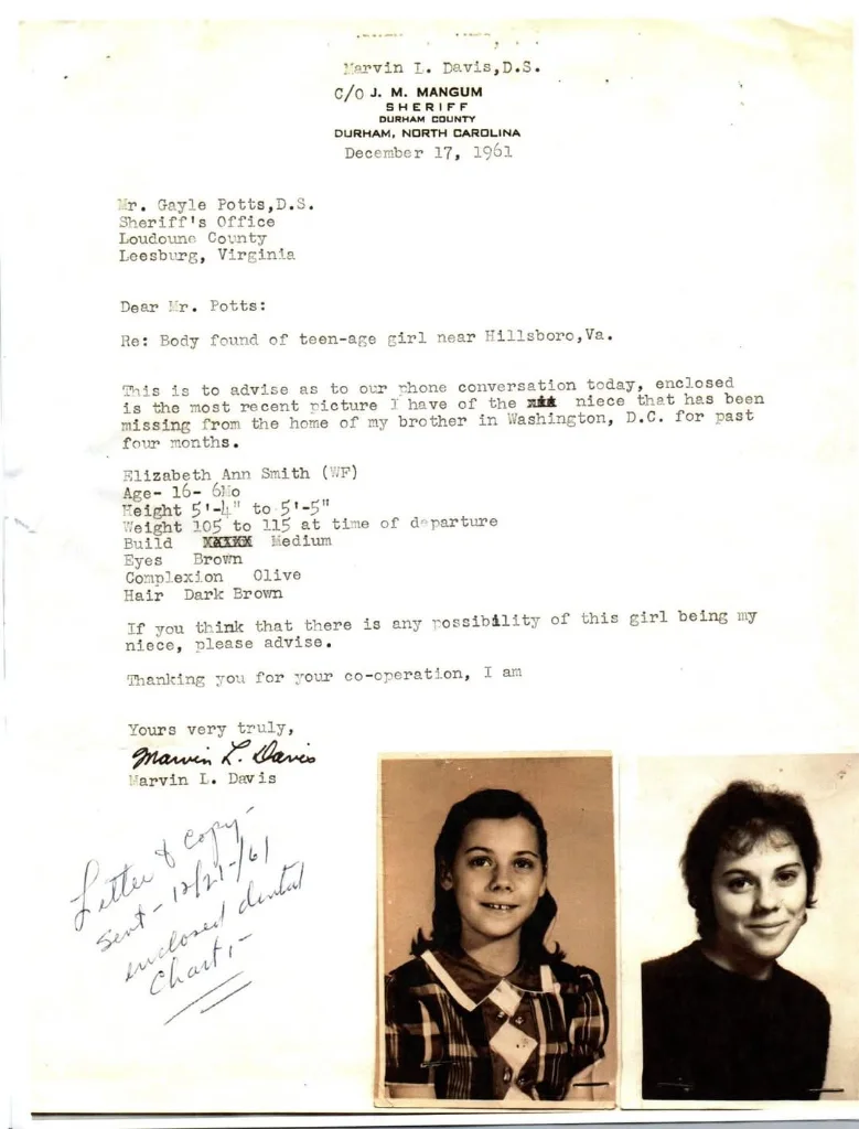 Smith's family dynamic gets more intriguing the more I find. Sheriff Davis says that she went missing from his brother's home in D.C., and it didn't take me long to find that his brother Robert Ross Davis moved to D.C. around 1949 and was one of the leading ballet dancers with the Washington Ballet in the 1950s and 60s. (So Smith's father living in Arlington in the 50s may have had nothing to do with her move to the D.C. area after all.) Robert Davis apparently didn't get married until 1975, so Smith must have been living with a bachelor ballet dancer uncle only 11 or 12 years older than her. Again, not especially surprising that such a family situation meant that she could vanish easily.I poked around Ancestry a little more and did find Elizabeth Ann Smith in the 1950 census, living with her grandparents in NC. Also found what I presume is a family story about her mother Peggy in 1947: "Divorced and living at parents home with children Marvin Hudspeth and Ann Smith. Left for work one day, never returned nor heard from again." While the family may not have heard from mother Peggy again, there seems to be quite a bit of genealogical information about her life after that point, so there's not really two missing people in the family. The family situation certainly clarifies how Elizabeth Ann could have vanished without much notice in 1961, i.e. mom long out of the picture, rest of her mother's family still in North Carolina, dad possibly or possibly not involved in her life. Since Dad was living in Arlington, VA in the 50s, I'm guessing that's what might have brought her to DC, but it's only a guess.